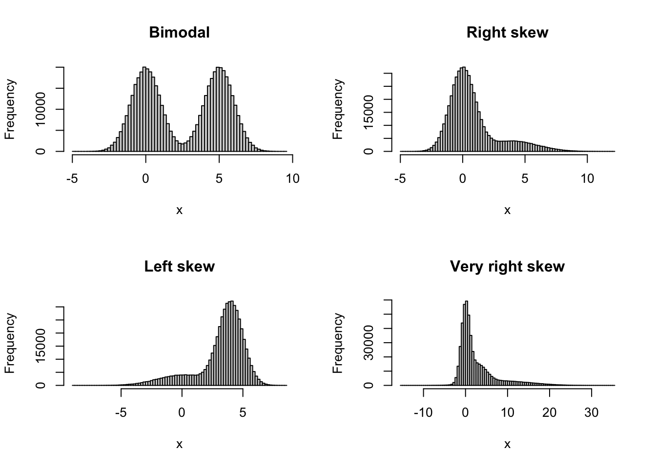 I wanted to know how well the tidymodels bootstrap test for the mean performed compared to similar tests: a traditional normality-based t-test, a second-order correct studentised t-test from boot.pval (the default in that package), and a first-order correct percentile t-test from boot.pval. To find out, I ran simulations where the data came from different non-normal distributions, to see if the different tests had the correct type I error rate for non-normal data. I tried four different skew and bimodal distributions, shown below.