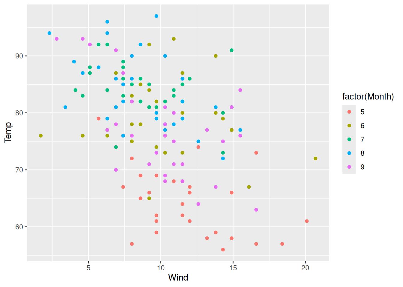 For this example, we’ll plot wind speed and temperature from the airquality data: